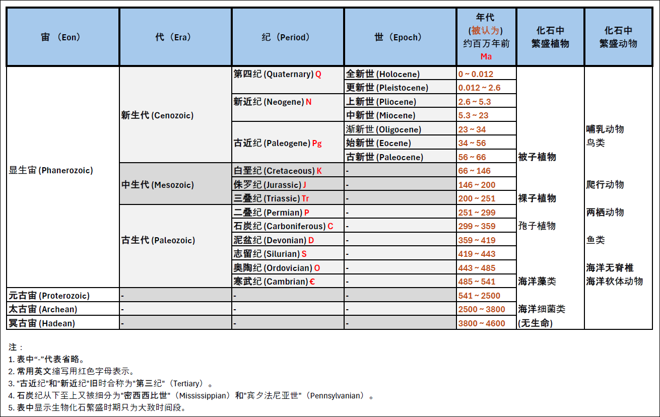 从现代主流学界秉持的地质年代表中,一些关键点值得我们注意: